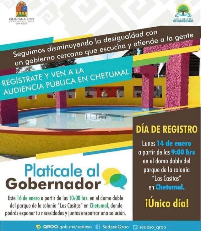 El día de hoy se llevará a cabo la audiencia pública con el gobernador del estado Carlos Joaquin Gonzales, en la ciudad de Chetumal en el domo del parque «Las Casitas».