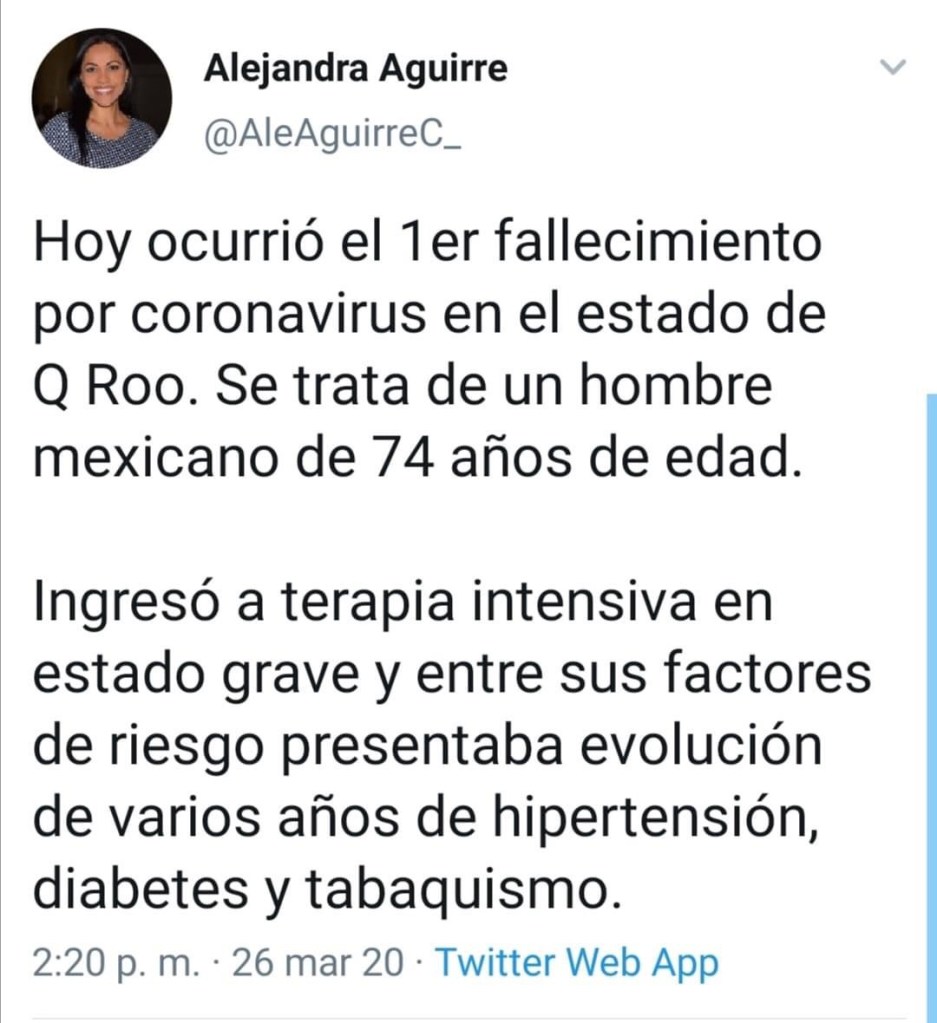 La primera víctima por Coronavirus se registró en el estado de Quintana Roo, se trata de un hombre de 74 años de edad, que ingresó a terapia intensiva en estado grave y entre sus factores de riesgo presentaba evolución de varios años de hipertensión, diabetes y tabaquismo.