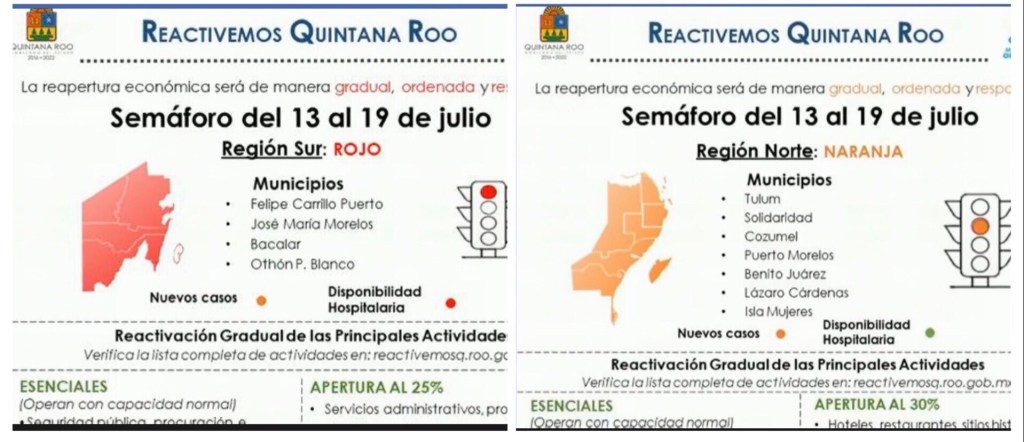 Cabe señalar que está modificación que se lleva a cabo en el mapa de reactivación económica de Quintana Roo, corresponde a la semana que va del día 13 al 19 de julio, por lo que las actividades se verán reducidas y el confinamiento vuelve a ser indispensable para salvaguardar la salud de los habitantes.