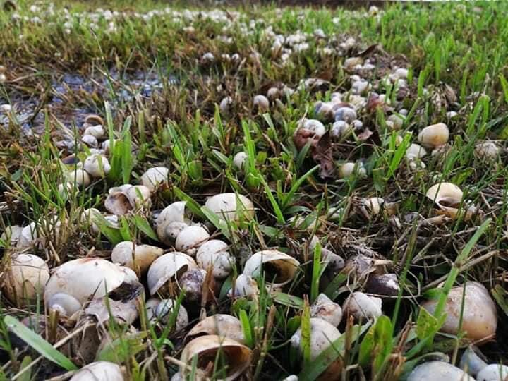 Los restos de Centenares de caracol chivita se encontraron en la orilla de la Laguna de Bacalar, estos son caracoles de agua dulce con branquias y un opérculo, acuáticos, gasterópodos, moluscos en la familia Ampullaridae.
