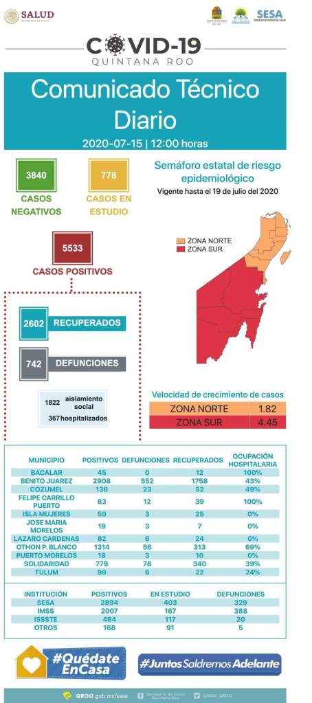 El estado de Quintana Roo se encuentra con 5 mil 533 casos positivos del nuevo coronavirus COVID-19, de los cuales 2189 son casos activos y el numero restante corresponde a los 2602 pacientes recuperados y a los 742 fallecidos por esa enfermedad.