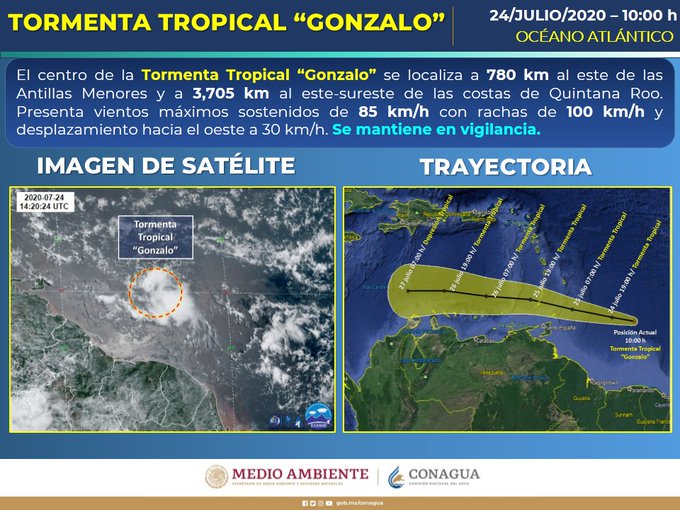 ((Aviso)): Con base al #SMNmx, se informa que el centro de la #TormentaTropical #Gonzalo se localiza a 3,705 km al este-sureste de las costas de #QRoo. No representa riego para el Estado por su ubicación, se pide a la ciudadanía mantenerse informada a través de fuentes oficiales.