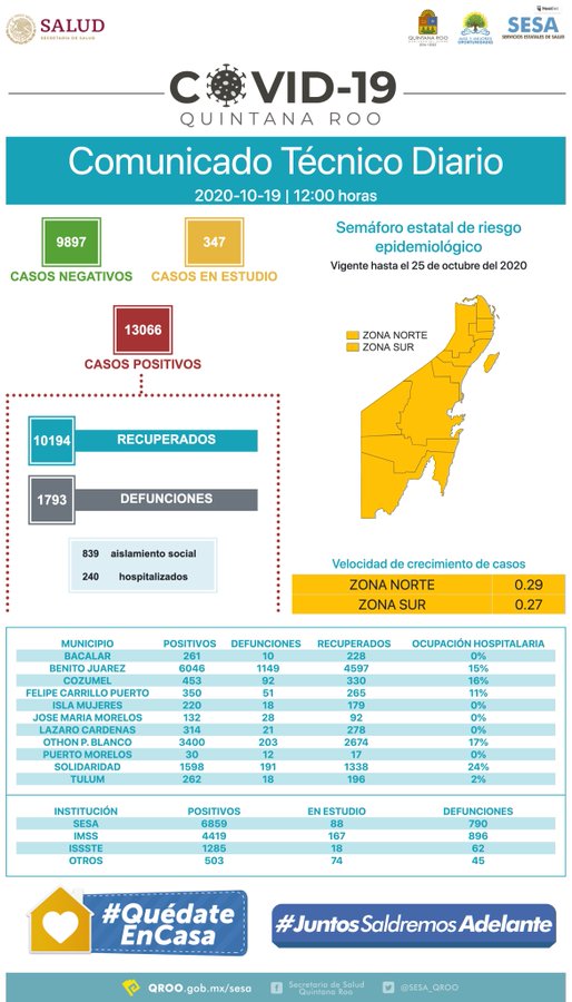 Quintana Roo.- Hasta las 12 horas del 19 de octubre, se han notificado 13 mil 66 casos positivos y mil 793 defunciones relacionadas a COVID-19, de igual manera 10 mil 194 personas se han recuperado de esta enfermedad, ademas de que se tiene 9 mil 897 casos negativos, 347 casos sospechosos permanecen en estudio.
