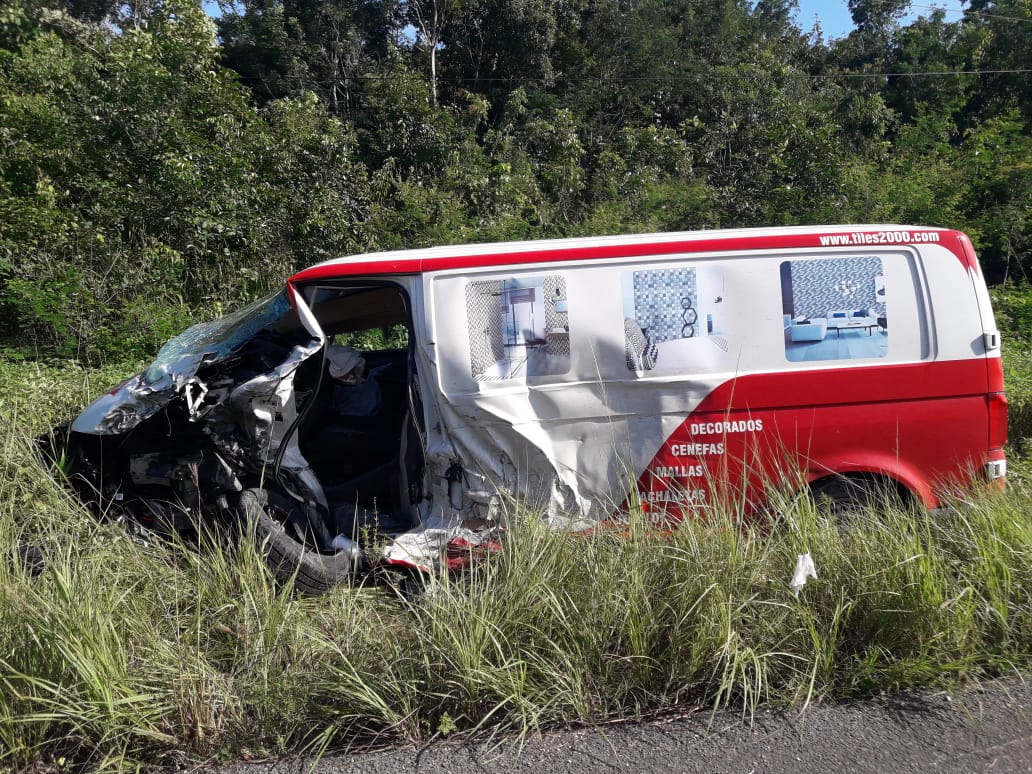 La tarde del pasado martes se registro un aparatoso accidente en la carretera federal 307, en el tramo carretero Bacalar-Buena Vista, donde una camioneta tipo Van termino siendo embestida por un tráiler que transportaba combustible cuando este intento rebasar a un vehículo sin la precaución debida, impactando a la combi que termino saliendo de la vía asfáltica por el impacto adema de que la parte del conductor quedo despedazada.