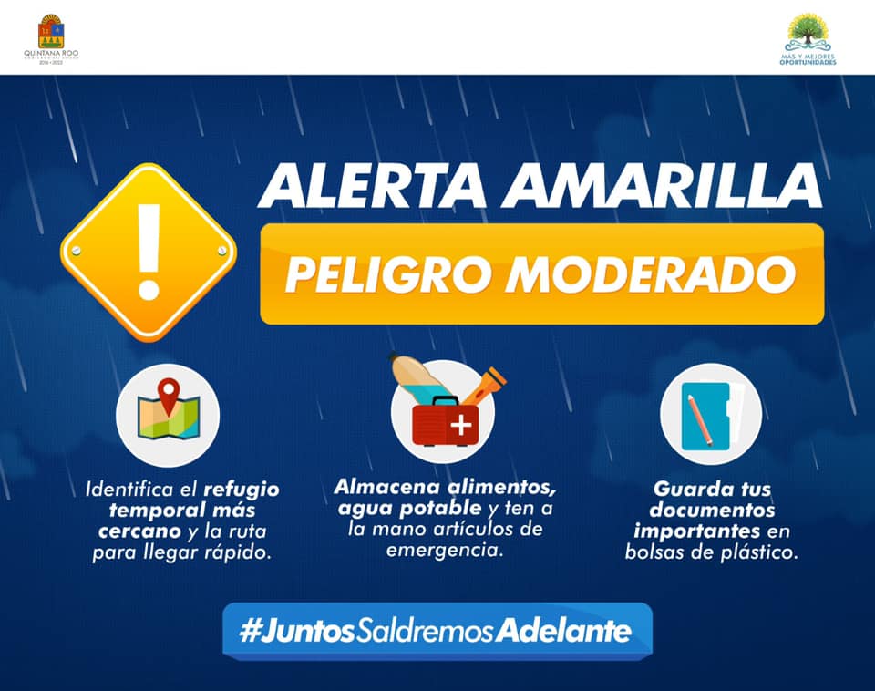 La alerta Amarilla (peligro moderado) para los municipios de centro del estado que son José María Morelos y Felipe Carrillo Puerto y la alerta Verde (peligro bajo) para Othón P. Blanco y Bacalar.