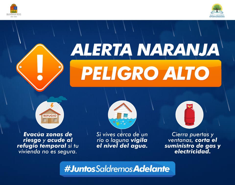 La coordinación estatal de protección civil dio a conocer que se emite la Alerta Naranja (peligro alto) para los municipios del norte de Quintana Roo, que son Tulum, Solidaridad, Cozumel, Puerto Morelos, Benito Juárez, Isla Mujeres y Lázaro Cárdenas.