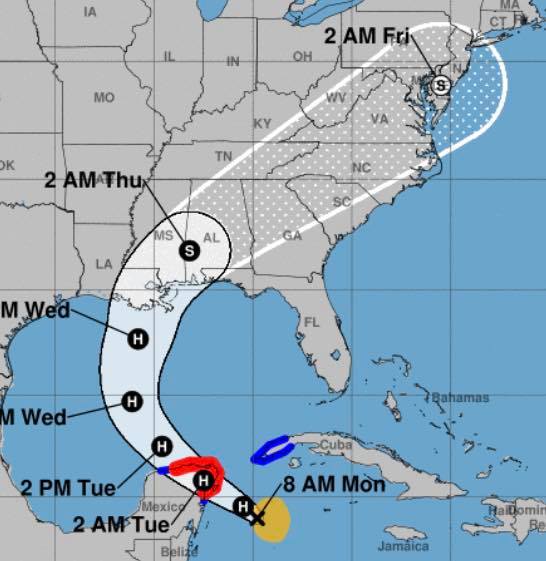Se estima que al medio día de hoy la aun tormenta tropical ZETA alcance el nivel de Huracán categoría 1 y debido a un ligero movimiento que sufrió durante la madrugada al comenzar a moverse, de nueva cuenta la trayectoria se vio con un movimiento ligero hacia el sur por lo que entraría directamente en el centro de la Isla de Cozumel y posteriormente alcanzaría a tocar tierra entre Tulum y Benito Juárez, en la zona conocida como Xpu-Ha.