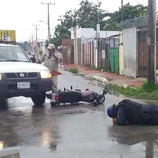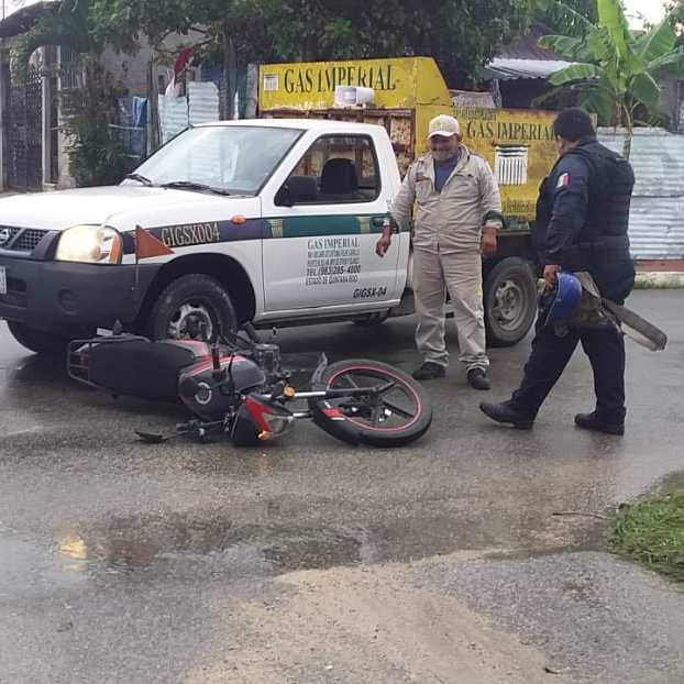 El pasado martes por la mañana un elemento de la Policía Quintana Roo fue atropellado en la ciudad de Chetumal en el cruce de la calle Naranjal con calle Chable, luego de que una camioneta de la empresa Gas Imperial invadió el carril de preferencia de la motocicleta al intentar dar una vuelta a su izquierda.