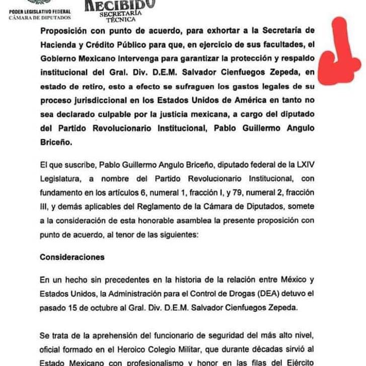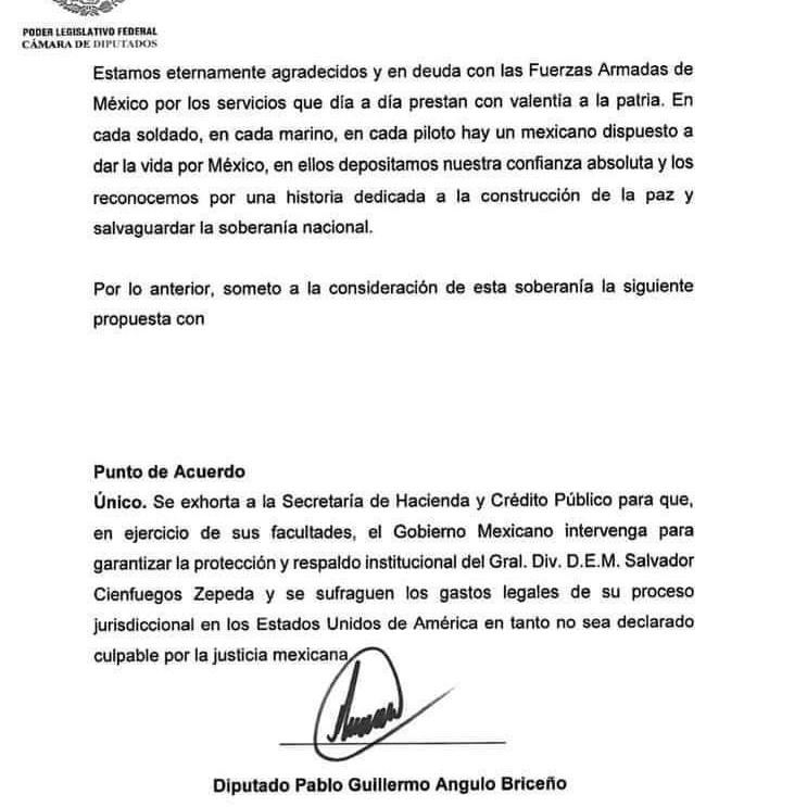 El diputado federal por el Partido Revolucionario Institucional (PRI) Pablo Guillermo Angulo Briceño, solicitó protección y respaldo económico al exsecretario de la Defensa Nacional, Salvador Cienfuegos, detenido recientemente en Estados Unidos, por presuntos nexos con el narcotráfico.