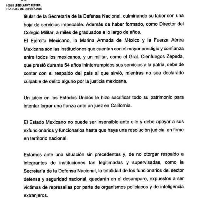 El Partido Revolucionario Institucional (PRI) señalo que se esta buscando evitar que los miembros de las Fuerzas Armadas Mexicanas queden expuestos a ser víctimas de represalias por parte de organismos policiacos y de inteligencia extranjeros. Incluso el partido tricolor hizo un llamado para que el Gobierno mexicano garantice la protección y respaldo institucional al General Salvador Cienfuegos Zepeda.