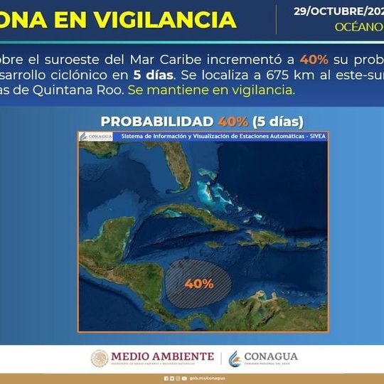 La Zona de Baja Presión ubicada en el Mar Caribe actualmente se encuentra ubicada a 675 kilómetros de Quintana Roo y esta a aumentado su probabilidad de desarrollo ciclónico, pasando de estar en un 30 porciento a un 40 porciento con 5 días para evolucionar en un sistema ciclónico.