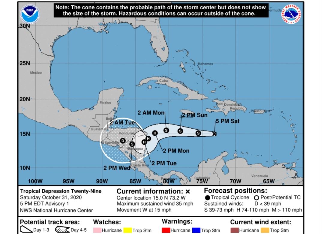 El Centro Nacional de Huracanes y el emitió la alerta por la depresión tropical numero 29, misma que se espera alcance a convertirse en tormenta tropical y finalmente llegue a la categoría de Huracán, actualmente esta tiene una trayectoria en la que impactaría las costas del país Nicaragua, aunque esta puede variar, por lo que se mantiene en constante vigilancia.