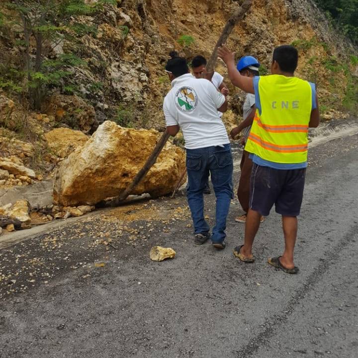 Elementos de la Comisión Nacional de Emergencias de la Ribera del Río Hondo, atendieron el reporte y se trasladaron hasta el sitio donde utilizaron herramientas manuales como picos, palas y hasta maderas, para poder remover el escombro que cayo a la vía de rodamiento y las grandes piedras que podían ocasionar accidentes viales.