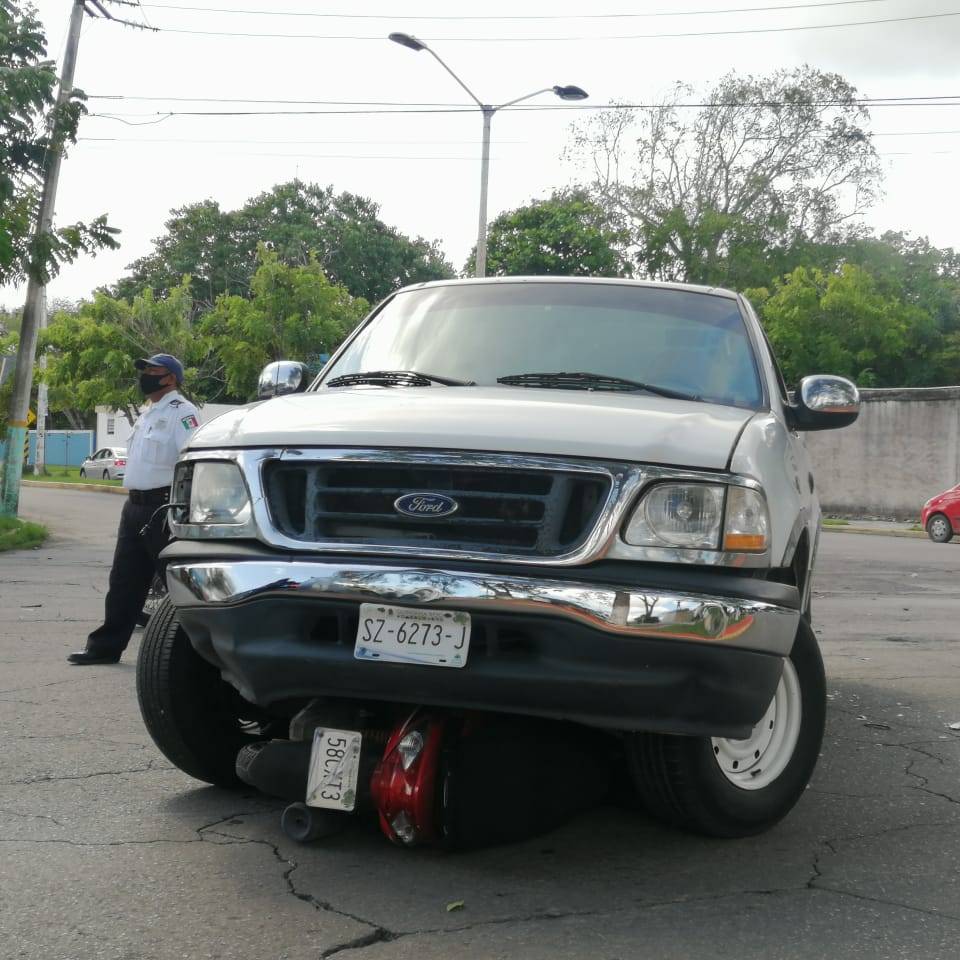 Este percance ocurrió a la 1 de la tarde de este domingo, cuando el alcoholizado sujeto identificado como José Antonio R.B. conducía su camioneta marca Ford F150 color blanca con placas de circulación SZ-6273-J sobre la calle Othón P. Blanco en dirección oriente a poniente y al llegar al cruce de la avenida Rafael Melgar, no respeto el señalamiento de alto y colisiono a la motocicleta Yamaha color rojo con placas de circulación 58CXT3 que era conducida por la señora Ana C.C. con preferencia de paso, en ese momento la mujer y su hija que iba de pasajera, fueron aventadas con fuerza hacia el camellón donde quedaron con golpes contusos y escoriaciones, mientras que el conductor de la camioneta intento darse a la fuga acelerando y arrastrando debajo la moto, logrando avanzar al menos dos kilómetros hasta llegar a la avenida Javier Rojo Gómez con San Salvador.