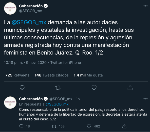 La secretaria de Gobernación a través de su cuenta de twitter @SEGOB_mx demandó a las autoridades municipales y estatales una investigación total del caso ocurrido en el municipio de Benito Juárez, por la represión y agresión armada en la que hubo uso excesivo de la fuerza por parte de las autoridades policiales durante las manifestaciones, por el feminicidio de la joven ‘Alexis’.
