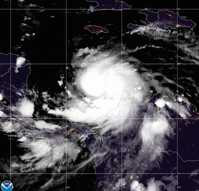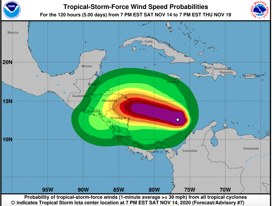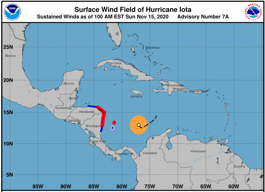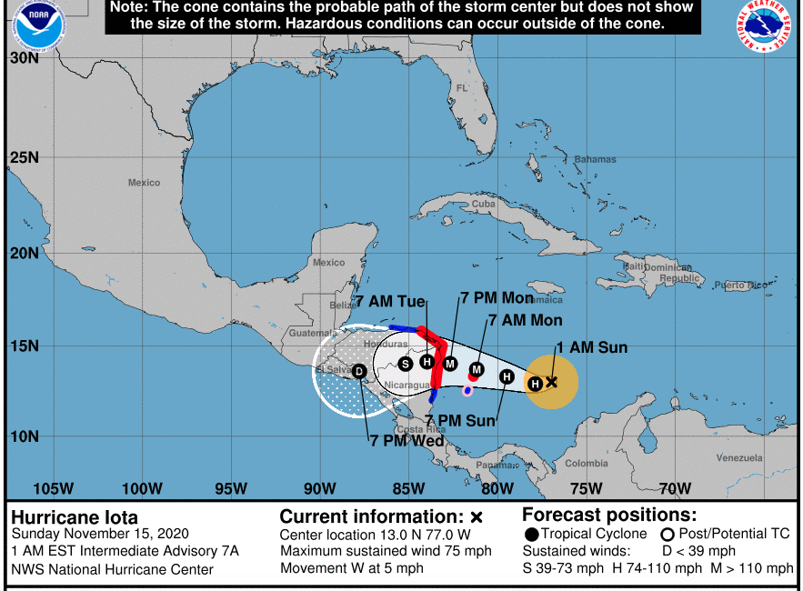 El Huracán IOTA se encuentra a 475 km al este de isla de providencia Colombia y 705 km de cabo Gracias a Dios en Nicaragua, actualmente presenta vientos máximos sostenidos 120 km/h y su movimiento es al oeste a 7 km/h, manteniendo una trayectoria que se dirige a las costas nicaragüenses.