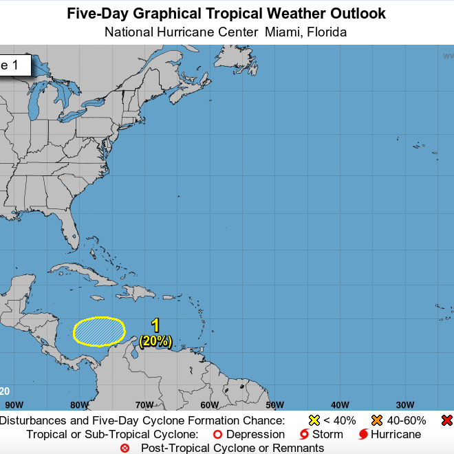 Aunque aun es muy anticipado decir que alcanzara la categoría de tormenta tropical, puesto que mantiene una probabilidad del 20 porciento de evolucionar, por lo que el centro nacional de Huracanes mantiene vigilancia en esta zona de baja presión.