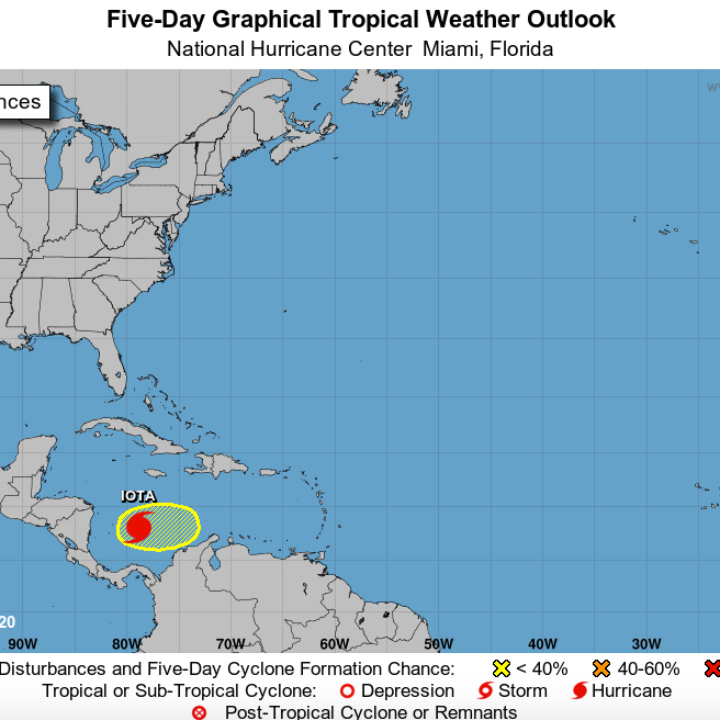 Por si fuera poco una nueva zona de baja presión se encuentra en el mar Caribe, esta viene detrás del Huracán IOTA y se estima que podría llegar a evolucionar en depresión tropical en los próximos días, aunque su trayectoria es con rumbo a Centro América y de llegar a ser una tormenta tropical se le daría el nombre de KAPPA.