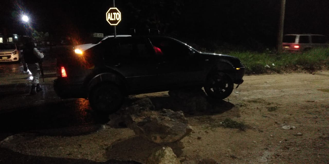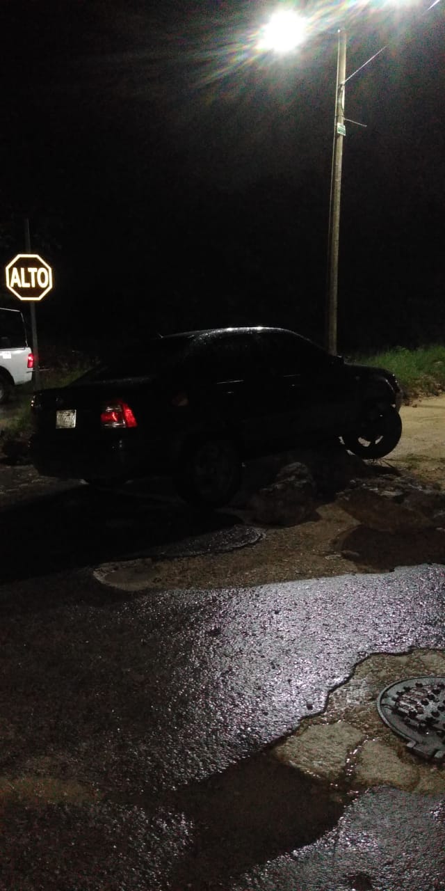 Un hombre que presuntamente viajaba bajo los influjos del alcohol a bordo de su vehículo en la el fraccionamiento las Américas 3 de Chetumal, terminó trepado en unas piedras que cerraban la vialidad para evitar los coches se atasquen en el lodo.
