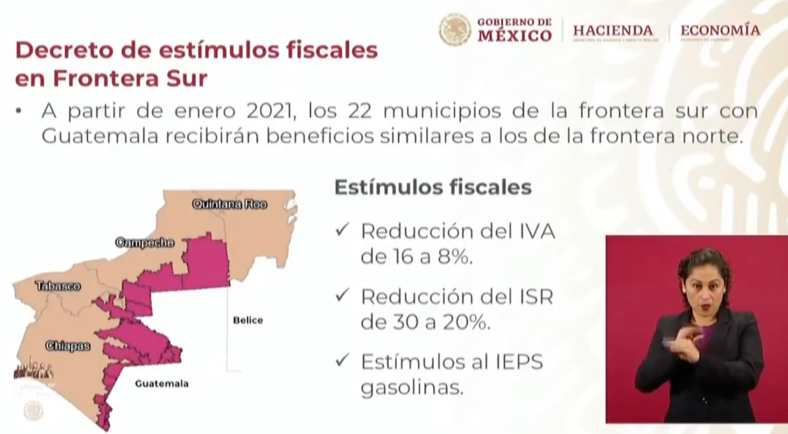 Mientras que los estímulos fiscales que entraran en vigor en los 22 municipios que tienen frontera con Guatemala serán: