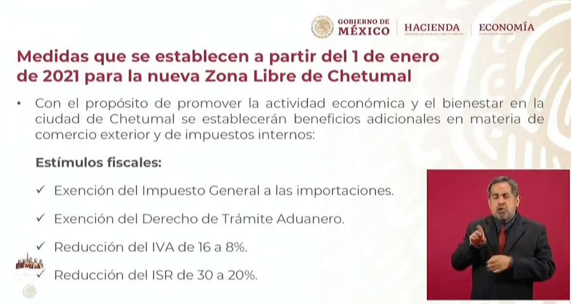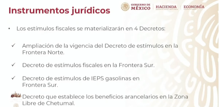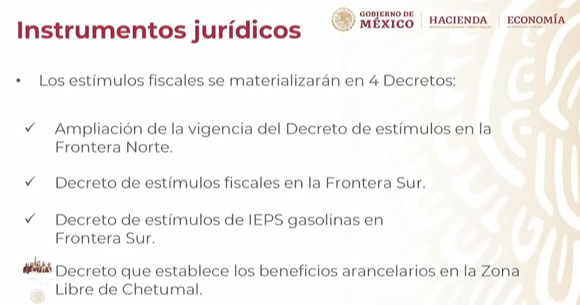 El primer decreto va enfocado en la frontera norte de México, traerá beneficios para aquella zona y este consiste en la ampliación del tiempo de estímulos fiscales hasta el año 2024, mientras que los decretos que son enfocados a la frontera sur traerán consigo beneficios muy parecidos aunque no iguales a los de la zona norte del país, incluso hay que precisar que en total son tres decretos que traerán estímulos en la franja fronteriza con Belice y Guatemala, y uno de estos enfocado precisamente a la ciudad de Chetumal.