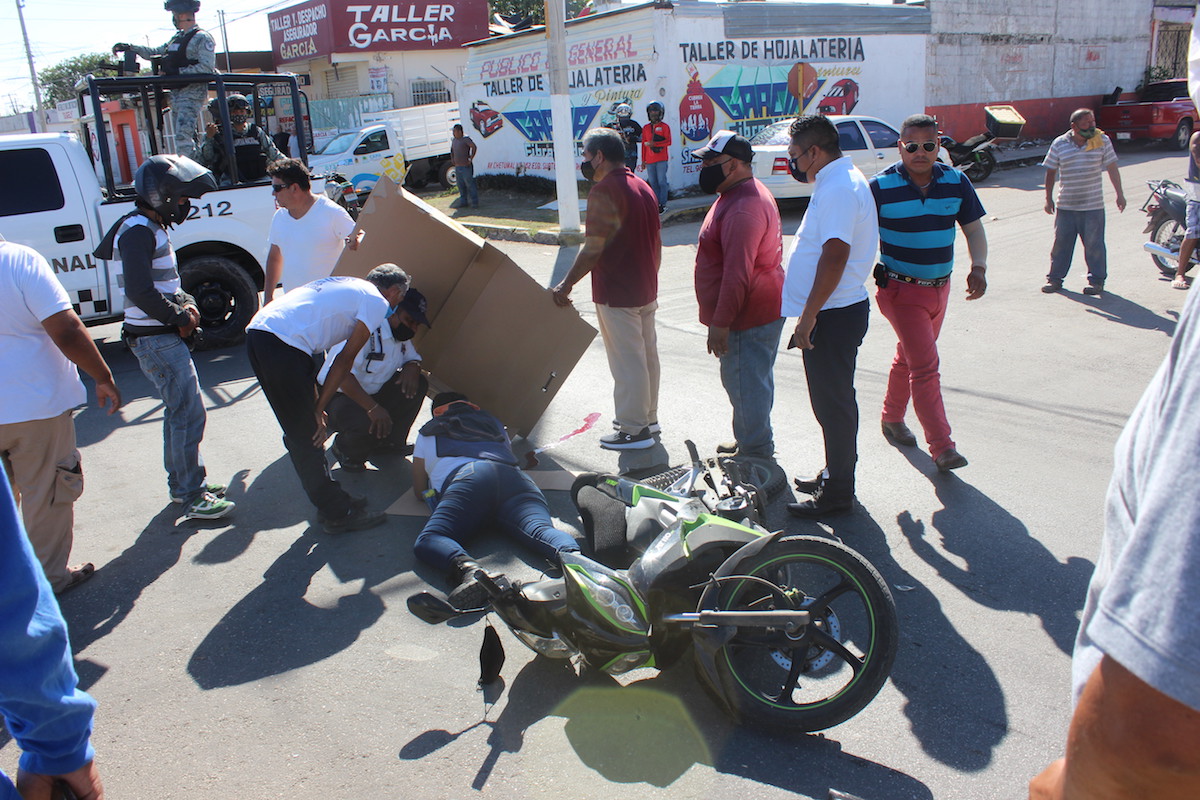 El percance ocurrió en el cruce de la avenida Chetumal con calle Subteniente López de la colonia Solidaridad, cuando la mujer que fue identificada con el nombre de Marisol iba manejando su motocicleta marca italika color negro con verde en dirección norte a sur con preferencia, cuando al llegar al cruce de la calle Subteniente López otro motociclista intento ganarle el paso, metiéndose en la trayectoria de la joven y provocando se impactaran y cayeran al suelo.