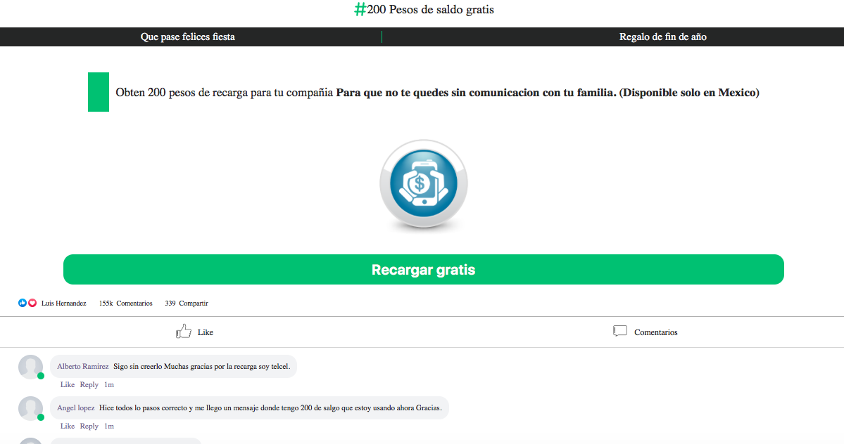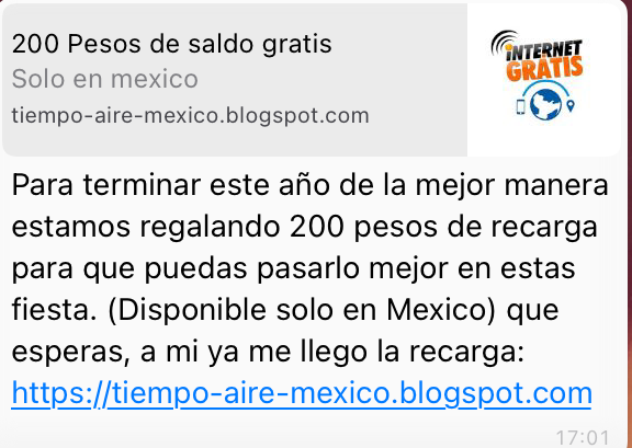 En las ultimas 48 horas ha circulado un mensaje en el que ofrecen un ‘regalo de fin de año’ con saldo de 200 pesos.