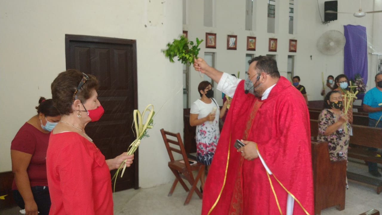 Al iniciar las celebraciones del Domingo de Ramos, este año no se realizó la procesión para evitar aglomeraciones, por lo que el rito de bendición de ramos se realizó antes de iniciar la misa, y se bendijeron al interior del templo.