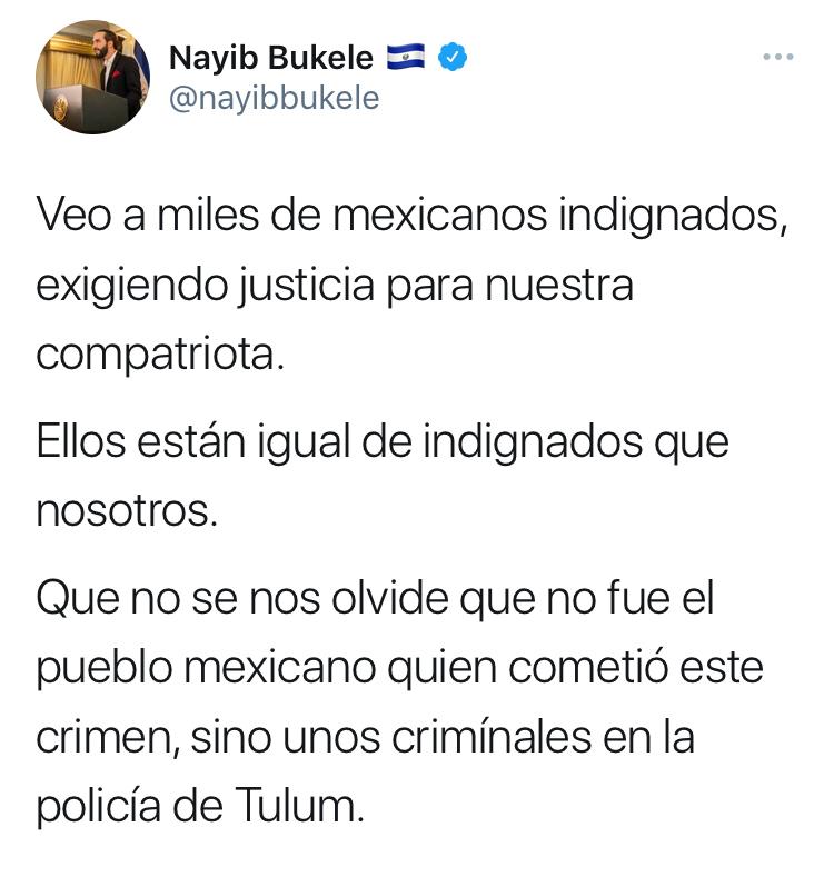 El presidente de El Salvador, Nayib Bukele a través de sus redes sociales mostró su desprecio y repudio ante la lamentable y atroz forma en que los Policías de Tulum le arrebataron la vida a su connacional, señalando espera que caiga todo el peso de la ley en estas personas.