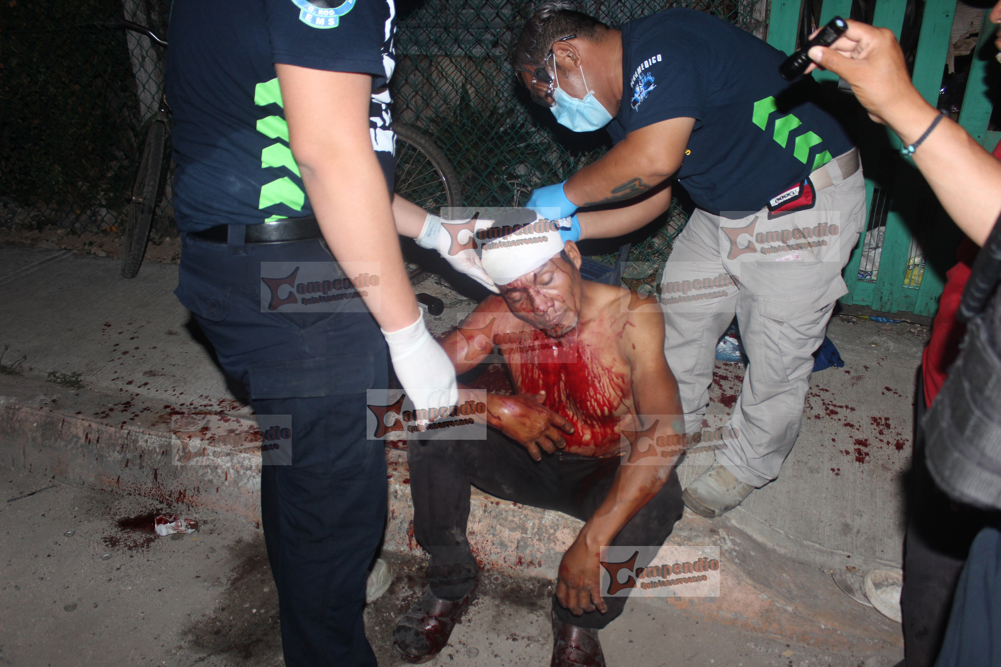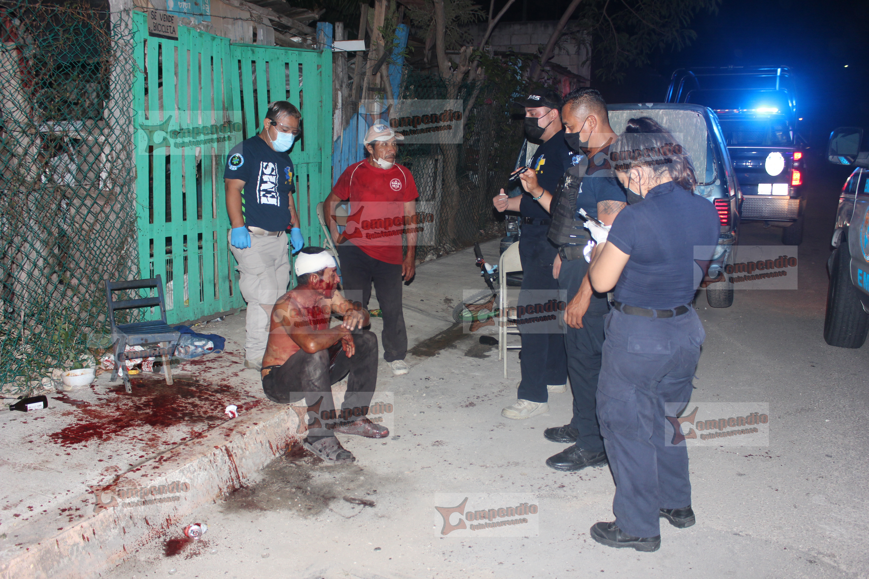 Los vecinos de la calle Sacxan con Raudales al ver el ‘espectáculo’ que se armo, no dudaron en llamar numero de emergencias 911 para que enviaran apoyo policiaco y medico ya que visualizaron a uno de los dos sujetos recibir un machetazo en la cabeza, en cuestión de minutos elementos de la Policía Quintana Roo y paramédicos de Emergencias Médicas del Sur arribaron al sitio y brindaron los primeros auxilios a un hombre que dijo llamarse Jose Cabrera, quien se encontraba completamente alcoholizado, este individuo dijo no quería traslado a ningún hospital, por lo que sus familiares indicaron lo llevarían a una clínica particular una vez se le bajara la ‘borrachera’.