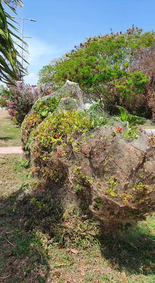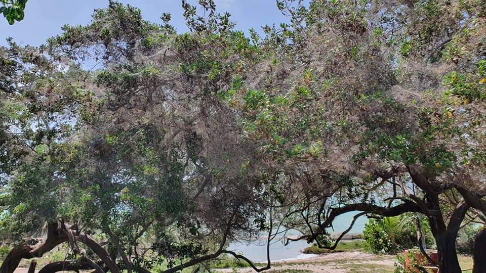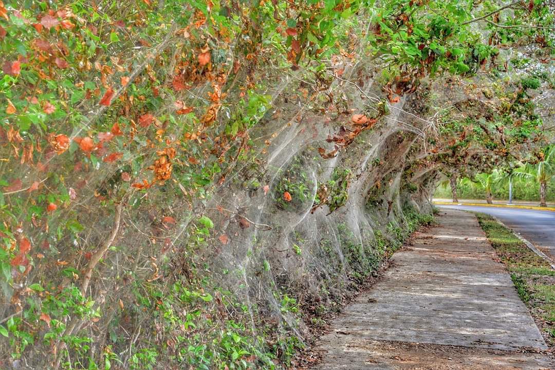 Los arácnidos han cubierto árboles enteros con sus telas a lo largo de la Bahía de Chetumal como respuesta a la abundancia de moscos bobos (Chironomidae), que desde hacía varias semanas estaban causando molestia a la población que vive en la parte baja de Chetumal.