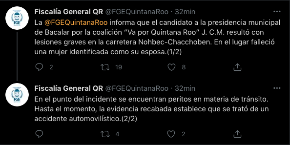 Tal y como hemos informado, José Contreras Méndez ‘Chepe’ sufrió una volcadura cuando se disponía a regresar a Bacalar tras llevar a cabo actividades proselitistas en la comunidad de Chacchoben, en el accidente su esposa falleció debido a las lesiones y el candidato a presidente municipal del décimo municipio permanece severamente lesionado en un hospital de Chetumal.
