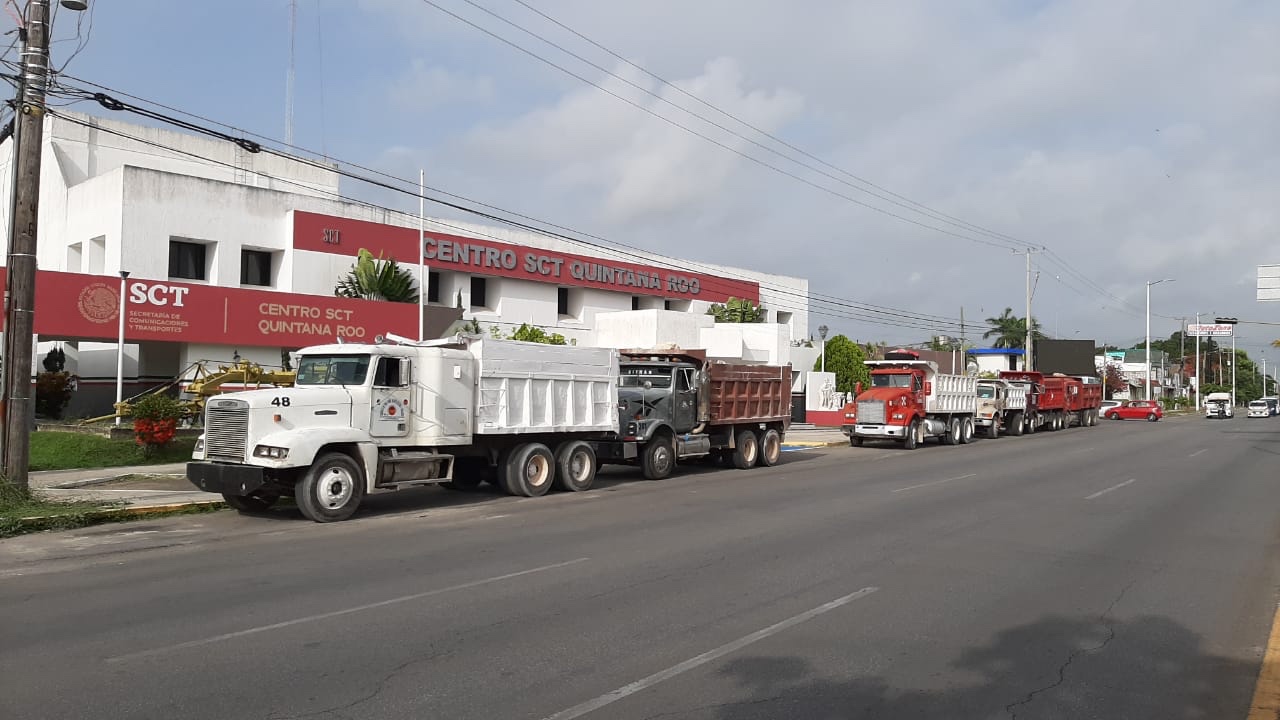 Los integrantes de los sindicatos de transportistas de servicio de volteo se manifestaron en el Centro SCT de Chetumal.