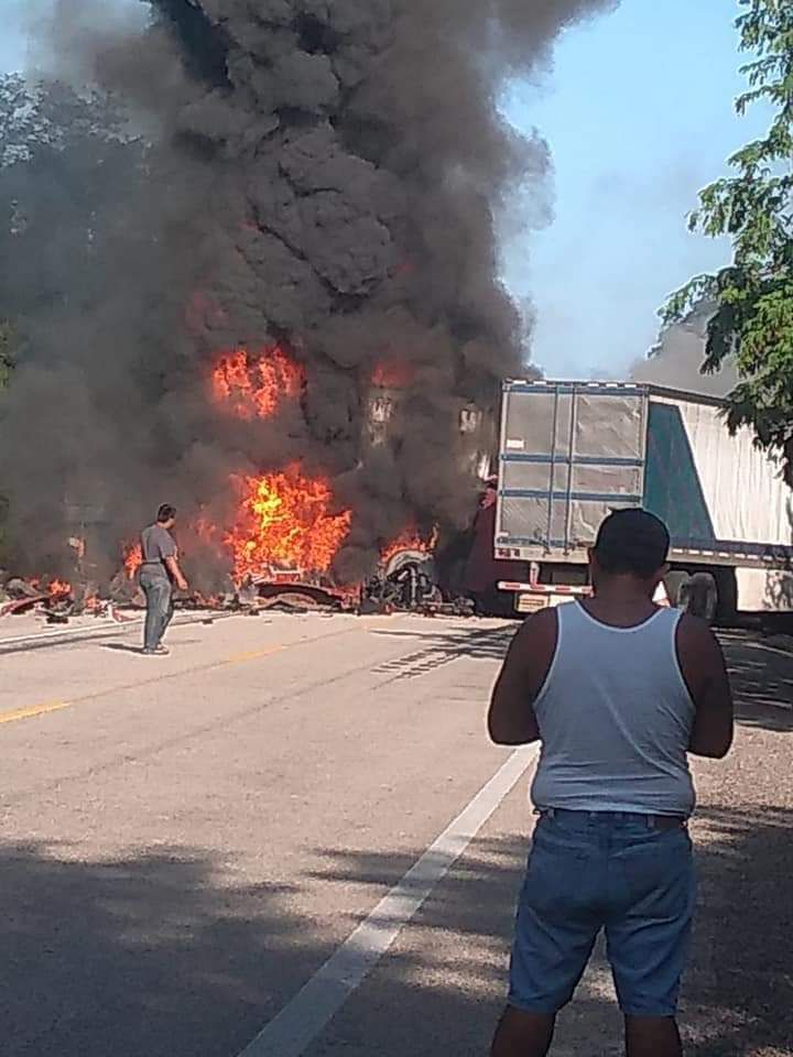 TRAGEDIA EN CARRETERA CHETUMAL – ESCÁRCEGA, TRÁILERS CHOCAN DE FRENTE Y SE INCENDIAN (VIDEO)
