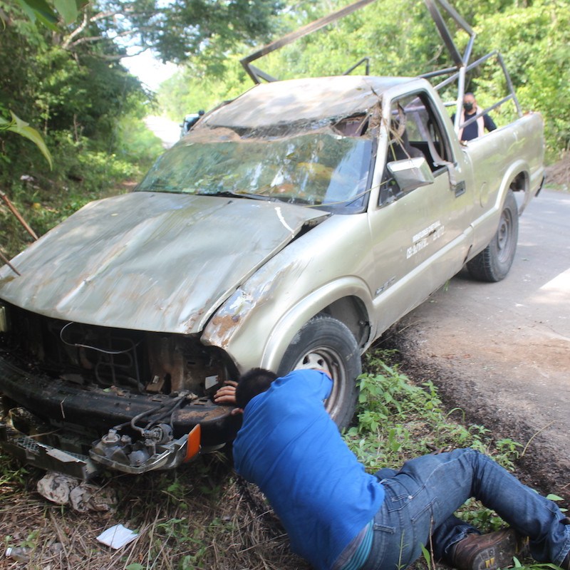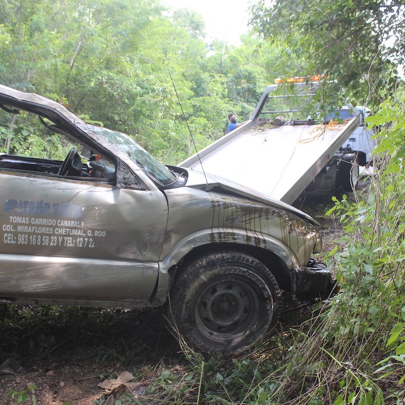 El incidente se reporto pasadas las 15:00 horas de este domingo sobre la carretera estatal Calderitas – Luis Echeverría a escasos 3 kilómetros de la glorieta que va a la comunidad de Laguna Guerrero, cuando el conductor de la camioneta marca Chevorlet pick up color gris, iba circulando en dirección a la ciudad de Chetumal, cuando el conductor perdió el control a causa de un desperfecto mecánico, lo que derivo en que volcara y quedara llantas arriba a un costado de la vía de rodamiento.
