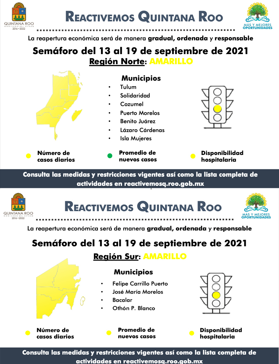 QUINTANA ROO VUELVE AL COLOR AMARILLO EN EL SEMÁFORO EPIDEMIOLÓGICO ESTATAL (DEL 13 AL 19 DE SEPTIEMBRE).