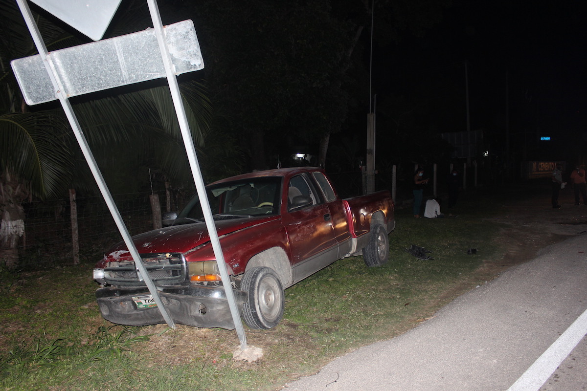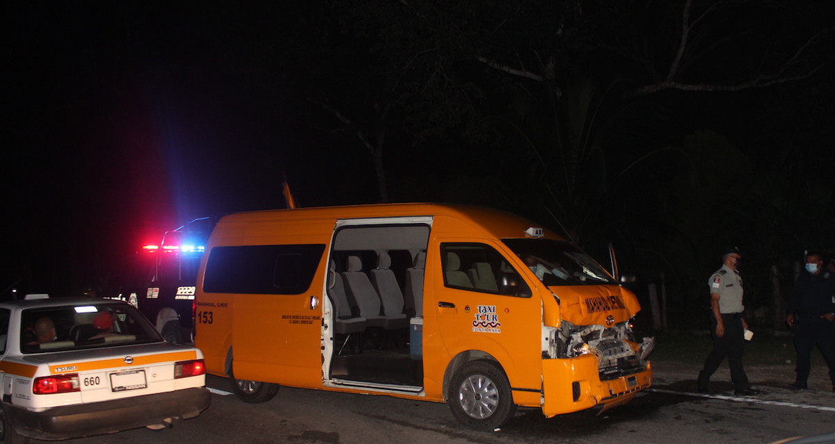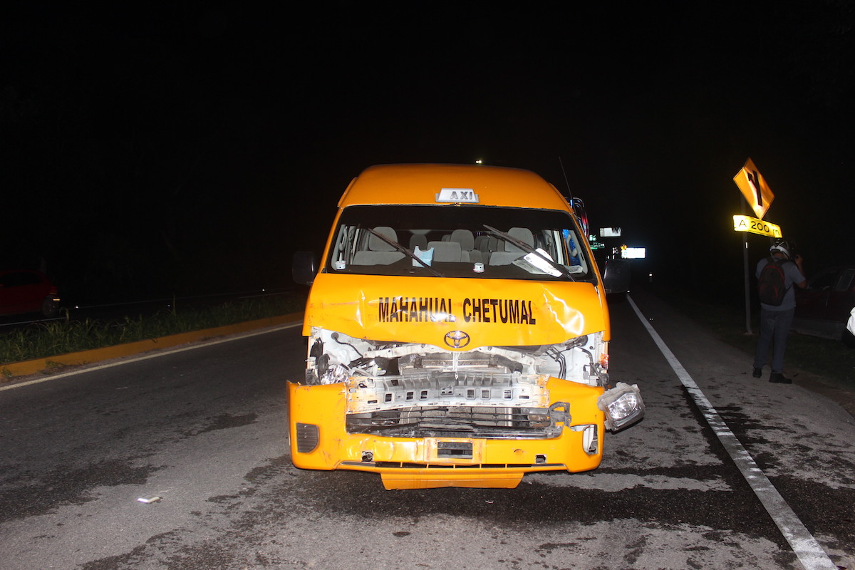 Un aparatoso accidente vehicular se registro en la entrada de la ciudad capital, cuando una combi de transporte de turistas colisiono contra una camioneta a escasos 200 metros de la entrada a la ciudad de Chetumal, sobre la carretera federal 307 a escasos 200 metros de la entrada a la ciudad de Chetumal, esto luego de qué una camioneta Dodge RAM color rojo realizará una maniobra inadecuada al intentar dar una vuelta en “U”, provocando ser impactado.