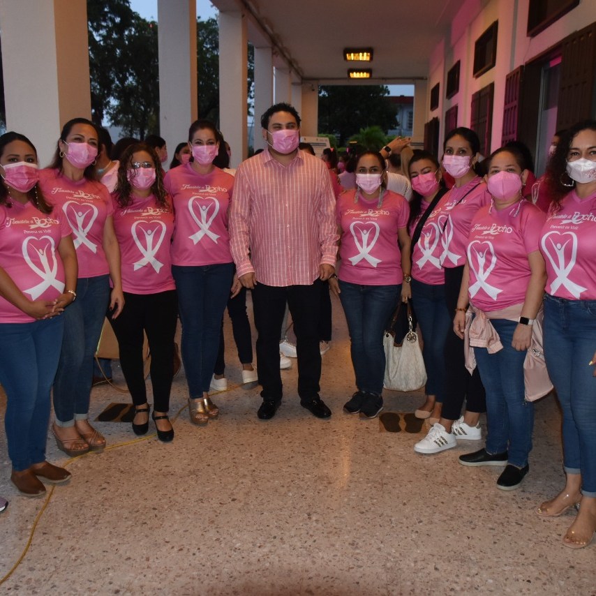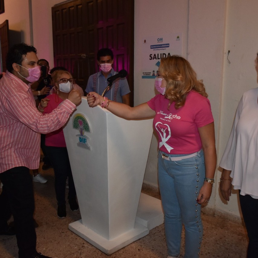 Chetumal, Q. Roo a 19 de octubre. – “Es importante redoblar esfuerzos para fortalecer las campañas de concientización y detección del cáncer de mama en mujeres y hombres”, indicó el presidente honorario del sistema DIF Othón P. Blanco, David Hernández Solís, en el marco del encendido de luces conmemorativo al Dia Mundial contra el Cáncer de Mama en Palacio de Gobierno del estado, evento que encabezó la presidenta honoraria del DIF Estatal, Gabriela Rejón de Joaquín.