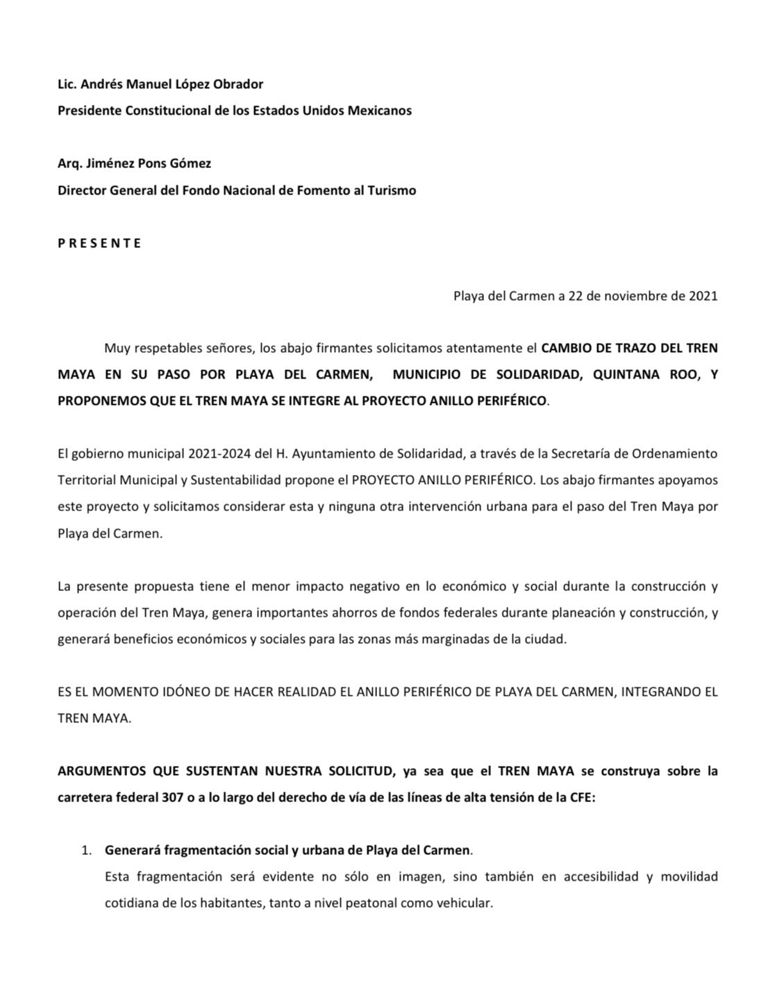Muy respetables señores, los abajo firmantes solicitamos atentamente el CAMBIO DE TRAZO DEL TREN MAYA EN SU PASO POR PLAYA DEL CARMEN, MUNICIPIO DE SOLIDARIDAD, QUINTANA ROO, Y PROPONEMOS QUE EL TREN MAYA SE INTEGRE AL PROYECTO ANILLO PERIFÉRICO.