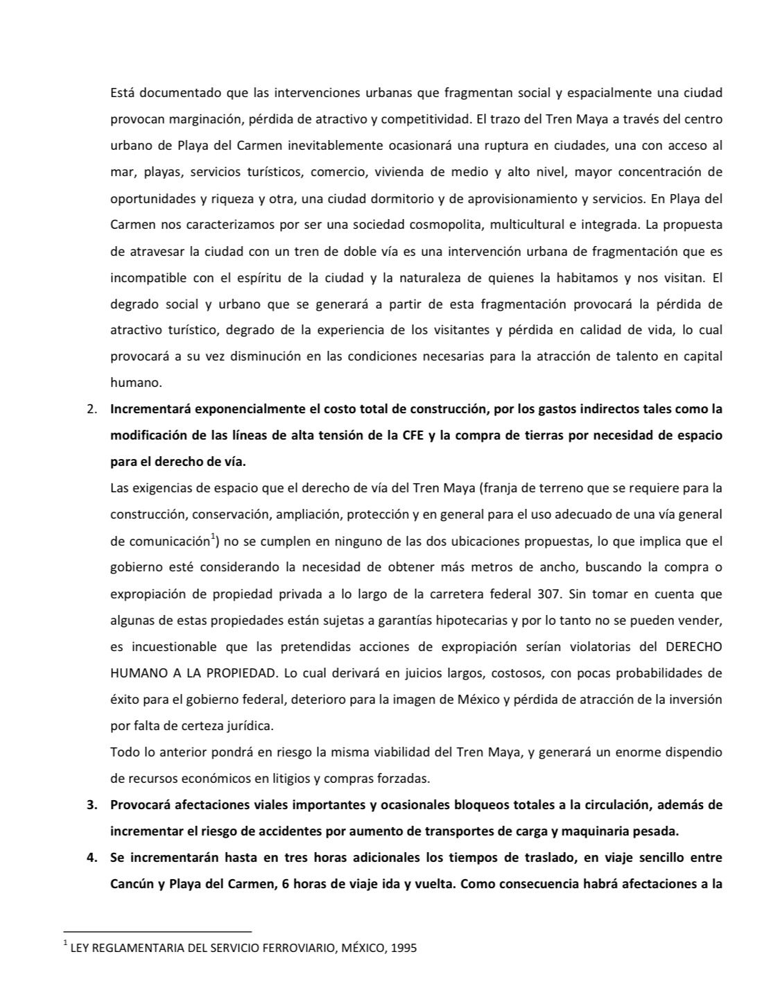 • Se evita la fragmentación socio-espacial de Playa del Carmen; dicha fragmentación será evidente; no sólo en imagen, sino también en accesibilidad y movilidad cotidiana de los habitantes; tanto a nivel peatonal como vehicular. Está documentado que las intervenciones urbanas que fragmentan social y espacialmente una ciudad provocan marginación, pérdida de atractivo y competitividad. El trazo del Tren Maya a través del Centro Urbano de Playa del Carmen inevitablemente ocasionará una ruptura en ciudades: una con acceso al mar, playas, servicios turísticos, comercio, vivienda de medio y alto nivel, mayor concentración de oportunidades y riqueza; y otra, una ciudad dormitorio y de aprovisionamiento y servicios. En Playa del Carmen nos caracterizamos por ser una sociedad cosmopolita, multicultural e integrada. La propuesta de atravesar la ciudad con un tren de doble vía es una intervención urbana de fragmentación que es incompatible con el espíritu de la ciudad y la naturaleza de quienes la habitamos y nos visitan.
