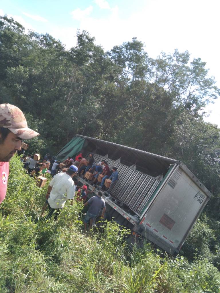 El camión transportaba cerveza y la gente cargo sus camionetas con cartones de cerveza dejando vacío el remolque, una vez llego la grúa para sacar la unidad del monte, las personas se retiraron.