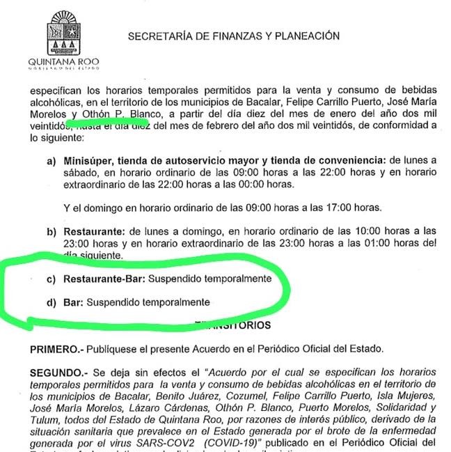 Ante tal situación la titular de la Secretaría de Finanzas y Planeación en Quintana Roo, Yohanet Torres Muñoz, dio a conocer que si se podrá vender bebidas alcohólicas en estos espacios siempre y cuando se venda junto con alimentos, es decir si uno consume alimentos podrá ingerir bebidas alcohólicas, puesto que en la tabla que aparece en el periódico oficial del estado, se señala que será suspensión temporal aunque no será una suspensión como tal.