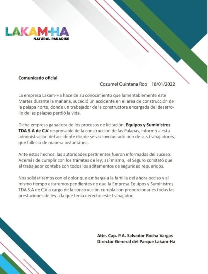 La dirección general de este proyecto, Lakam-Ha, emitió un comunicado en el que informó lo acontecido con el trabajador y señalaron estarán pendientes que al empresa que lo contrato que es Equipos y Suministros TDA S.A de C.V, se haga cargo de brindar la atención y apoyo a la familia del hoy occiso y se cumpla con todas las prestaciones de ley a la que tenía derecho el trabajador.