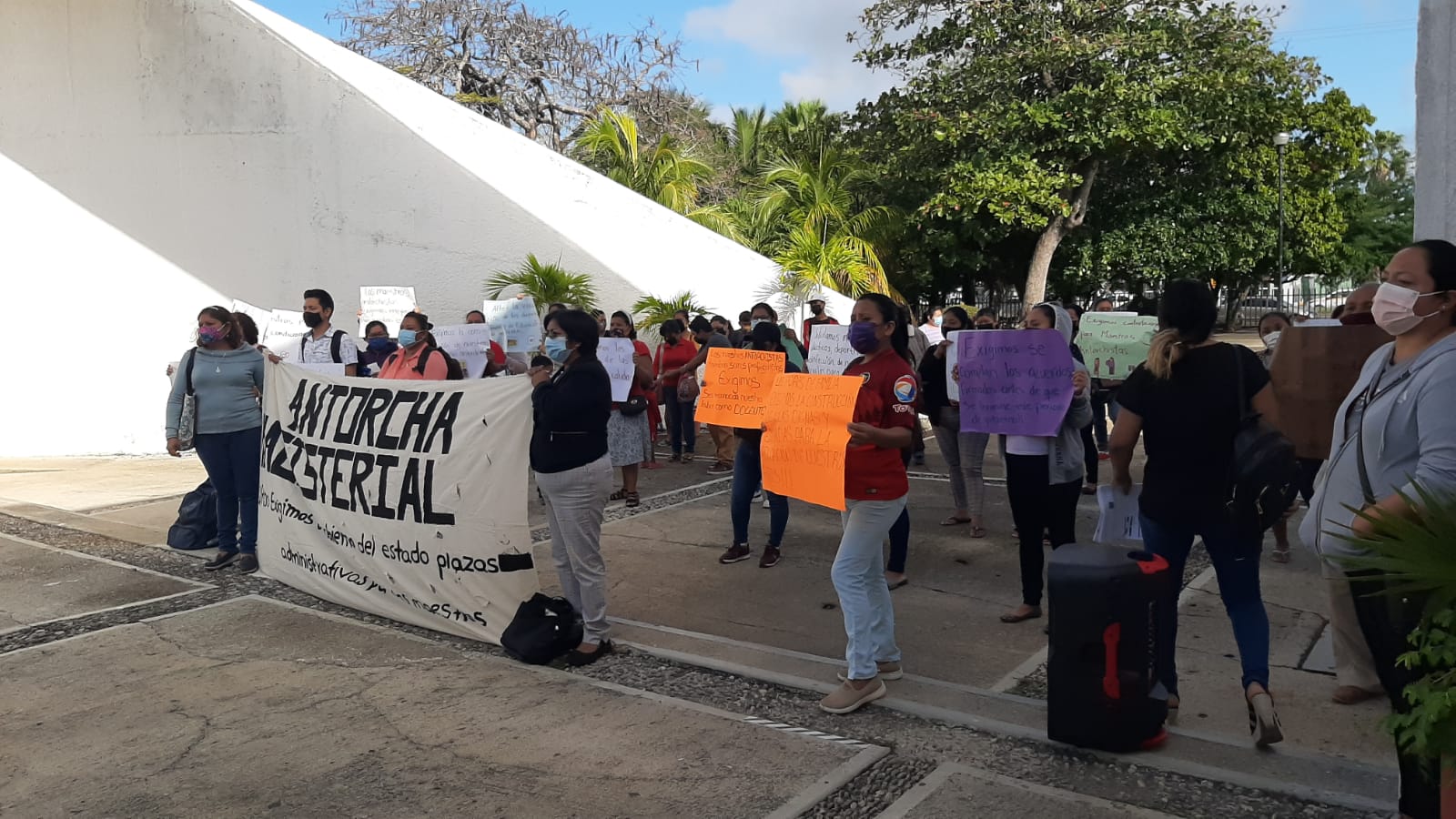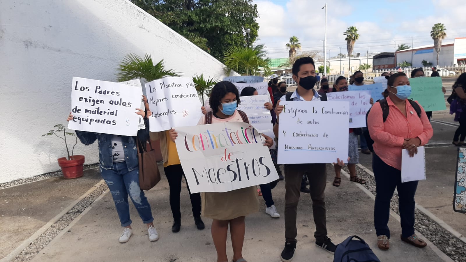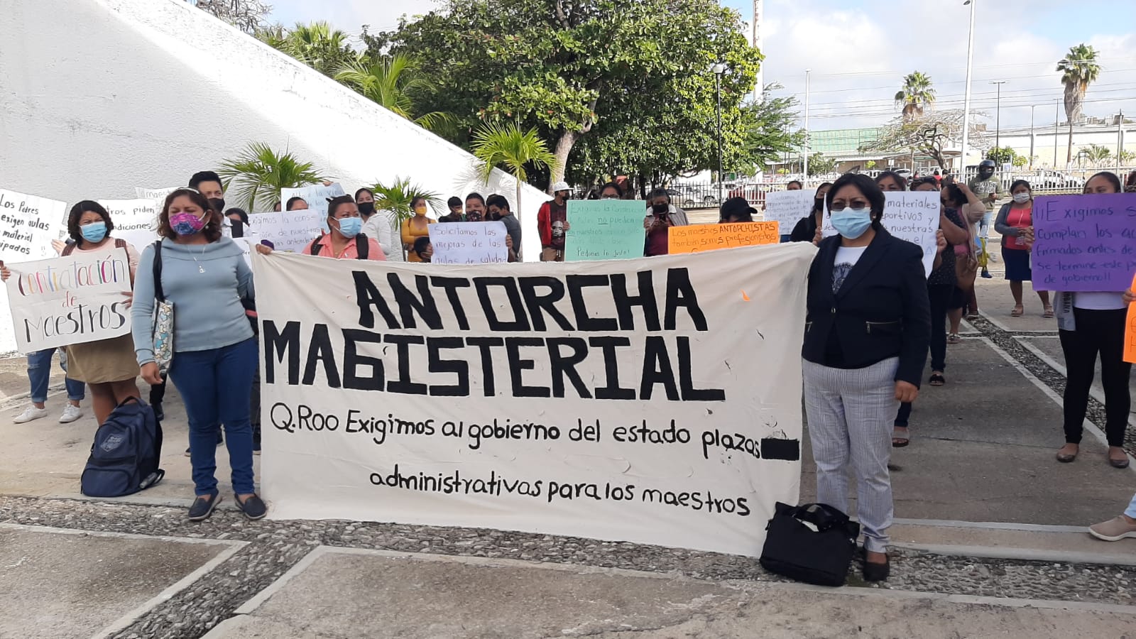 Al menos 50 personas, entre maestros y padres de familia de las colonias Mártires y Fraternidad Antorchistas, se manifiestan esta mañana en las instalaciones de la Secretaria de Educación de Quintana Roo (SEQ), esto con el fin de exigir se cumplan los acuerdos signados con el gobernador del Estado, Carlos Joaquín González, para beneficio de los alumnos de tales colonias.