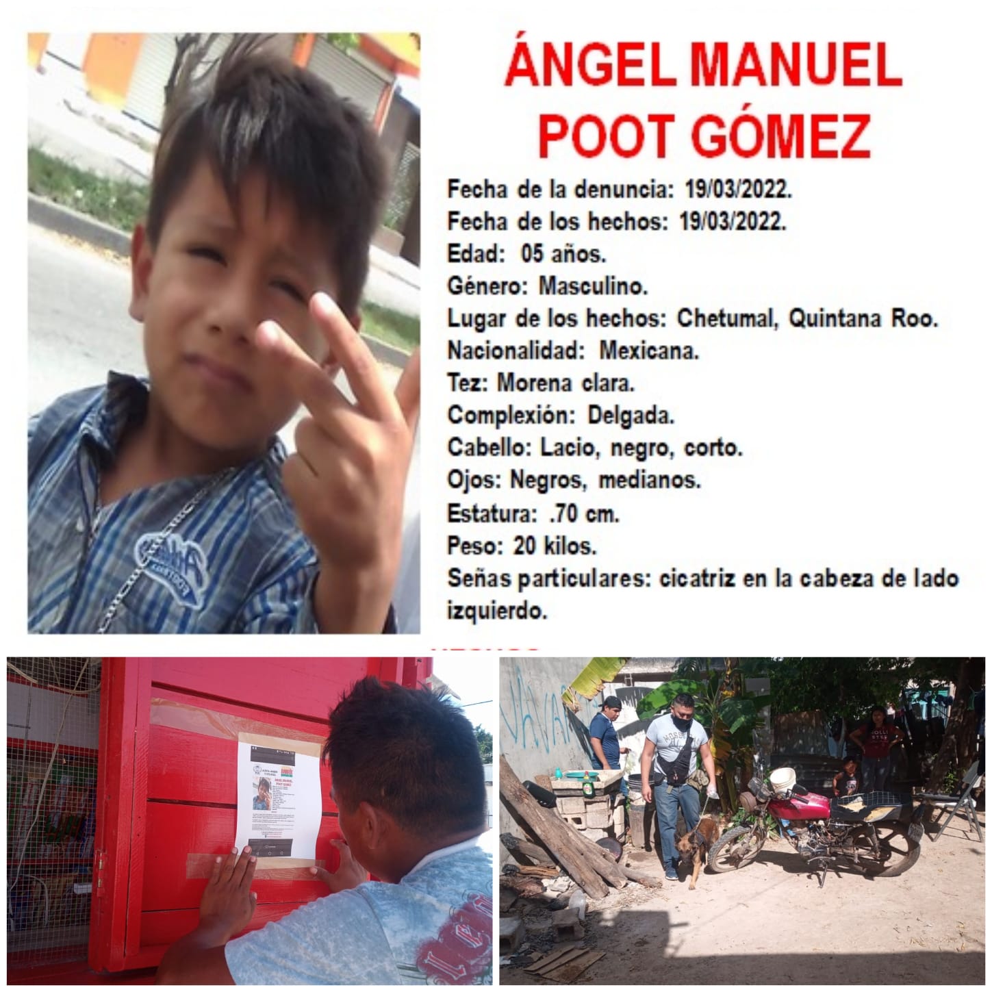 LAS AUTORIDADES Y LA SOCIEDAD CONTINÚAN CON LA BUSQUEDA. La extraña desaparición del pequeño Ángel Manuel Poot Gómez ha consternado a la población Chetumaleña, ‘Angelito’ como le dicen de cariño por sus familiares y amigos, es un niñito de 5 años que desapareció la mañana del sábado 19 de marzo y al pasar las horas,SigueSigue leyendo «¡PERTURBADORA DESAPARICIÓN! UN NIÑO DE 5 AÑOS LLEVA MÁS DE 35 HORAS DESAPARECIDO. «NO HABÍA PASADO NI UNA HORA DESDE QUE ME FUI, CUANDO ME DIJERON QUE MI HIJO HABIA DESAPARECIDO Y ME REGRESE DE VOLADA».»