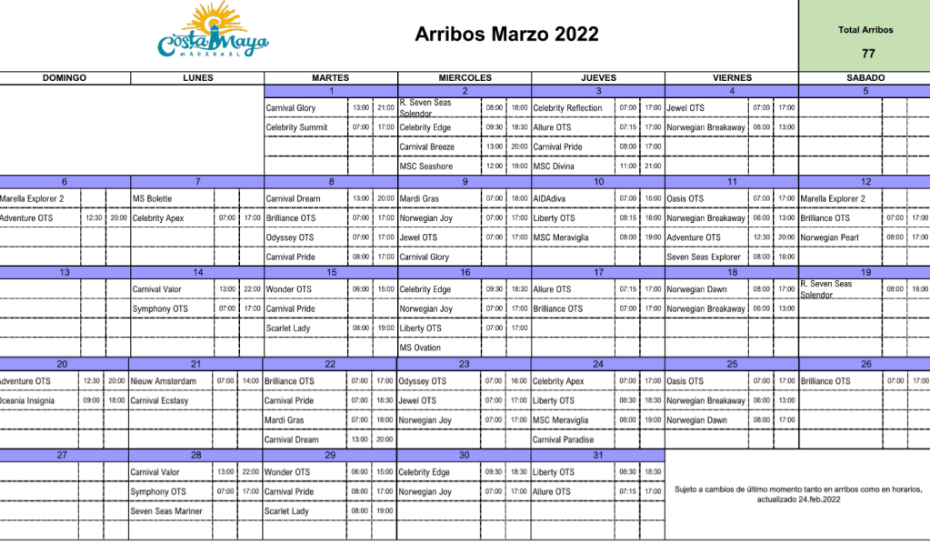 Actualmente en el puerto costa maya se espera la llegada 77 cruceros, mismos que dejarán una derrama al puerco costa maya.