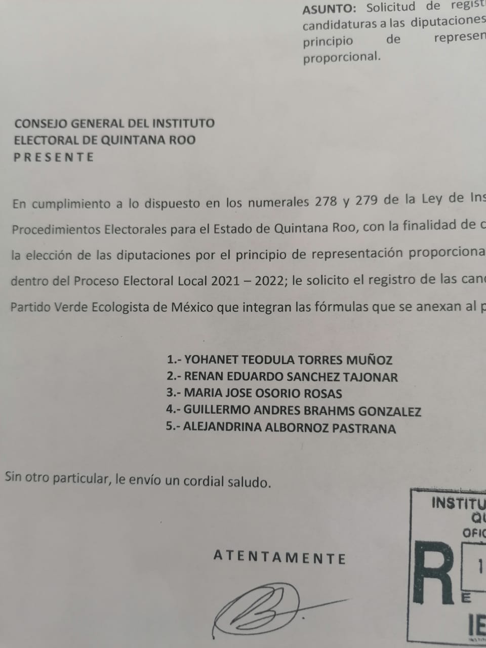 Esta tarde la Ex Secretaria de Finanzas del estado de Quintana Roo llevo a cabo su registro ante el Instituto Electoral de Quintana Roo como pre candidata plurinominal por el Partido Verde, quedando como primera en la lista de pre candidatos que se entrego esta tarde.