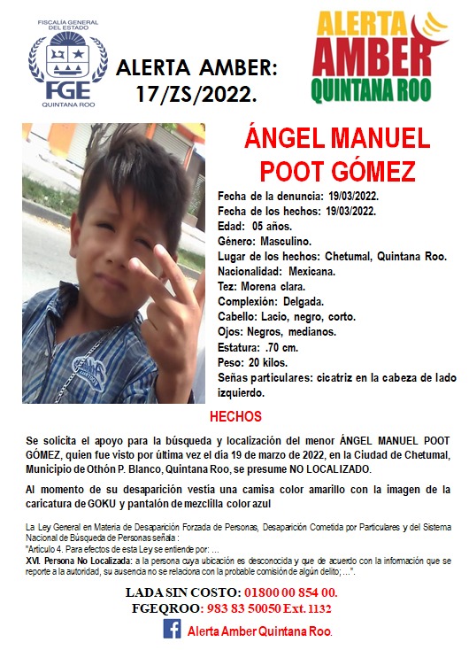 La extraña desaparición del pequeño Ángel Manuel Poot Gómez ha consternado a la población Chetumaleña, ‘Angelito’ como le dicen de cariño por sus familiares y amigos, es un niñito de 5 años que desapareció la mañana del sábado 19 de marzo y al pasar las horas, la frustración, miedo e incertidumbre de la familia crece con mayor demasía