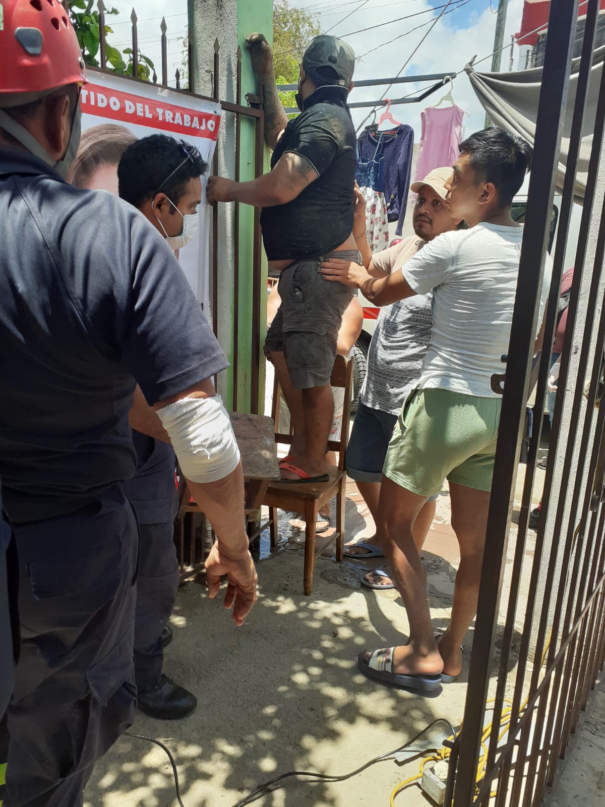 Sangrienta tarde se registro este lunes en la ciudad de Chetumal, donde un hombre estuvo a pocos centímetros de ser una víctima mortal en un accidente casero, aunque la posibilidad de perder la mano es latente, ya que cuando intentaba colgar una maya para evitar el sol, en un descuido resbalo de la escalera donde estaba parado y al caer se atravesó la muñeca con los metales de su reja, su abdomen fue raspado al momento de la caída, pero milagrosamente no se le clavaron ya que cayo a un lado.