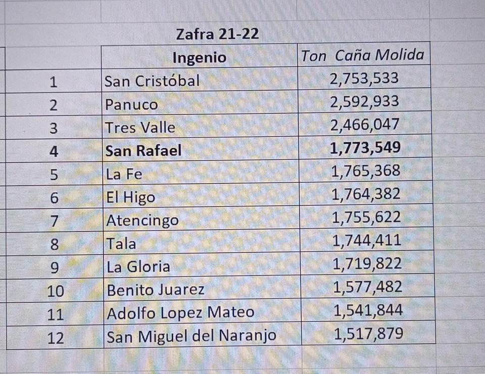 En la tabla se puede ver que los primeros cinco lugares fueron ocupados por los ingenios de San Cristóbal, en el Estado de Veracruz con dos millones 753 mil 533 toneladas, el de Pánuco, también en Veracruz con dos millones 592 mil 933 toneladas, el Tres Valles, también en Veracruz, con dos millones 466 mil 47 toneladas, el de San Rafael de Pucté, en Quintana Roo, con un millón 773 mil 549 toneladas y el quinto lugar lo ocupo el ingenio La Fe, en el municipio Pujiltic del Estado de Chiapas, con un millón 765 mil 368 toneladas.